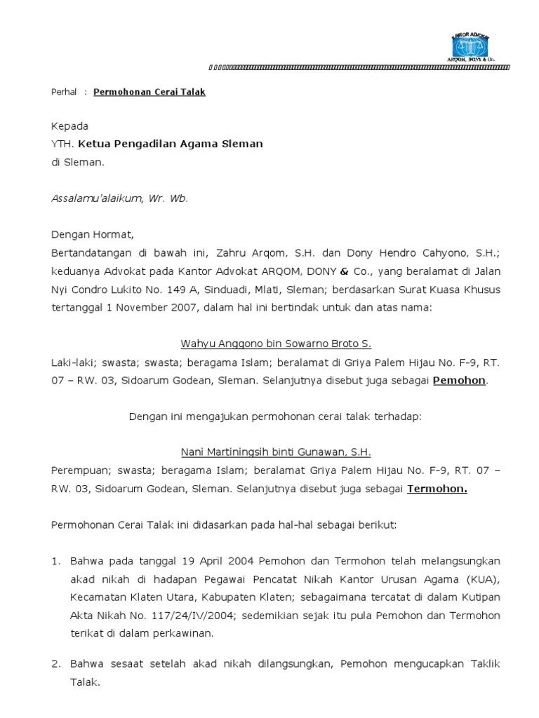 Contoh gugatan perceraian di pengadilan negeri sidoarjo hendro contoh surat perjanjian cerai. Contoh surat permohonan cerai talak pdf google drive.
